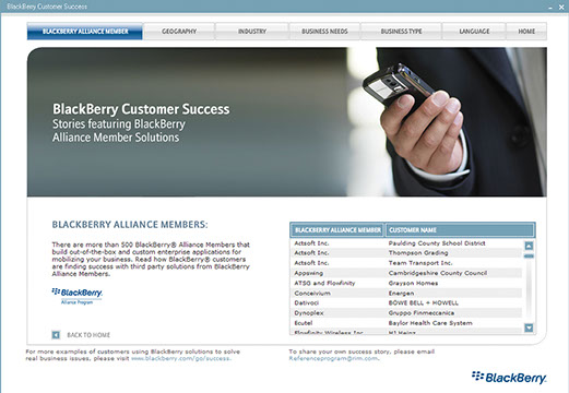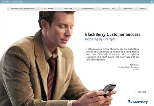 Flash with XML: Interactive case studies for RIM landing page. 5 languages.
